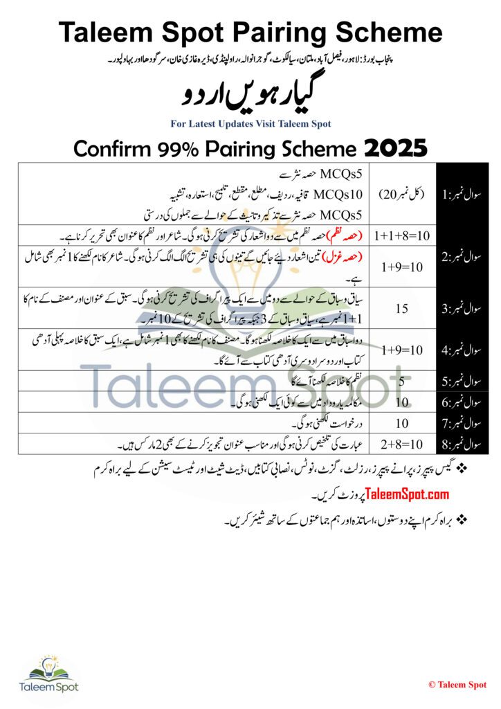 The 11th Class 1st Year Urdu Pairing Scheme Punjab Board 2025 is a well-structured guide designed to assist students in understanding the distribution of questions and marks. This becomes crucial as students transition from rote learning to more conceptual and analytical study approaches in 11th grade.