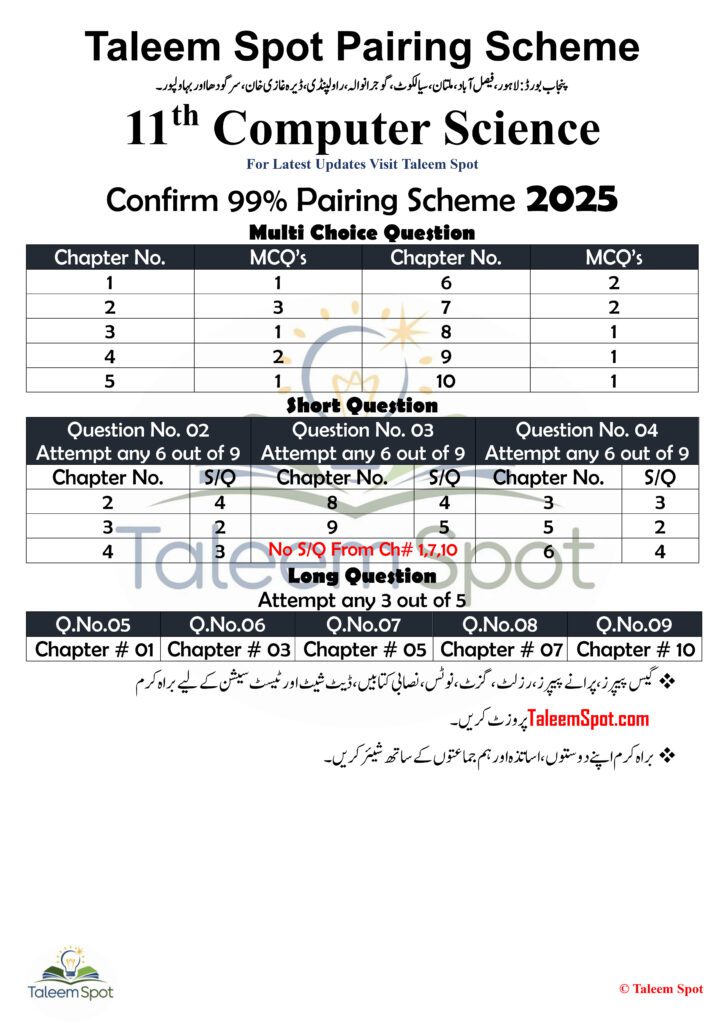 The 11th Class Computer Science Pairing Scheme Punjab Board 2025 is an invaluable tool for students looking to excel in their exams. By providing a clear structure for question distribution, it helps students streamline their preparation, save time, and focus on critical areas.