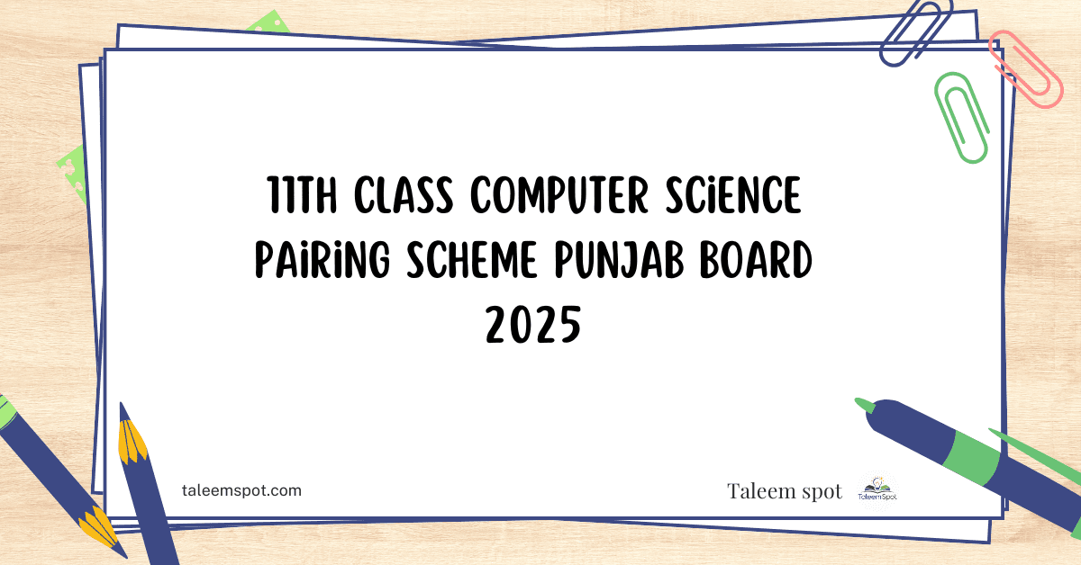 The 11th Class Computer Science Pairing Scheme Punjab Board 2025 outlines the distribution of questions into various sections such as MCQs, short questions, and long questions. It pairs chapters to help students understand the exam pattern and prioritize their preparation effectively.