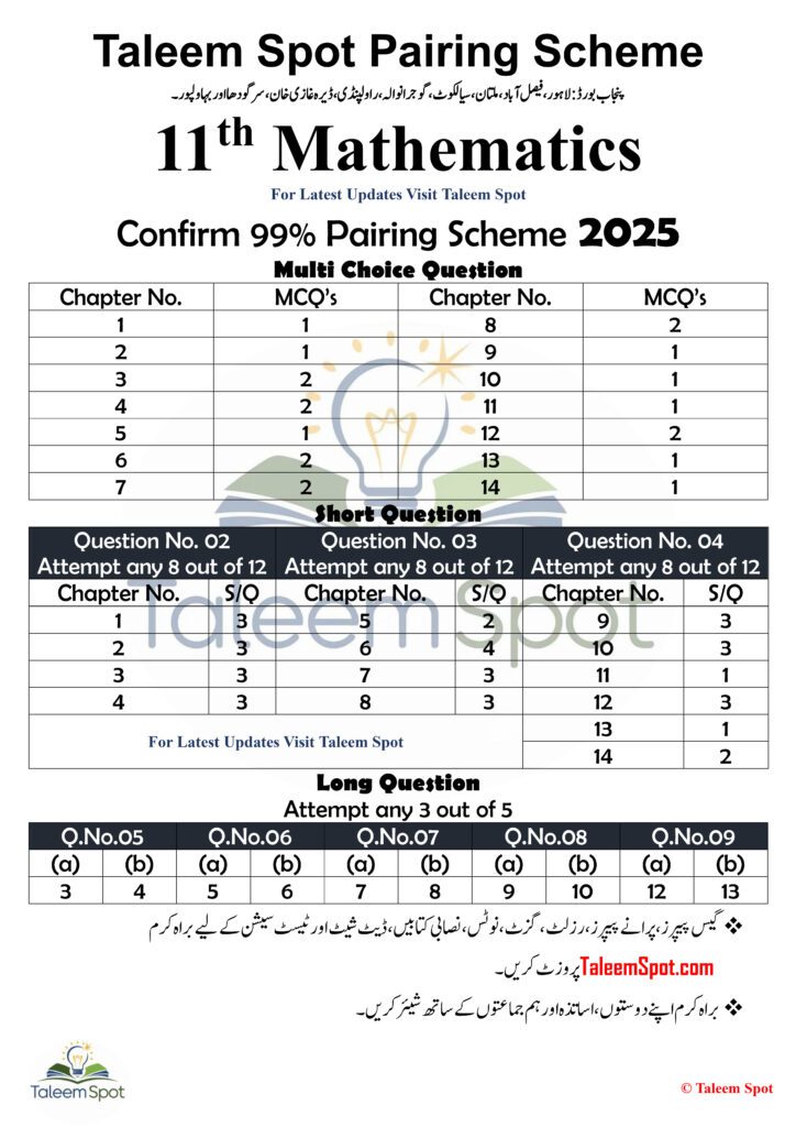 The 11th Class Math Pairing Scheme Punjab Board 2025 is a game-changer for students aiming to excel in their mathematics exams. By clearly defining chapter pairings and question patterns, the scheme helps students focus on critical topics, balance their preparation, and avoid exam-day surprises.