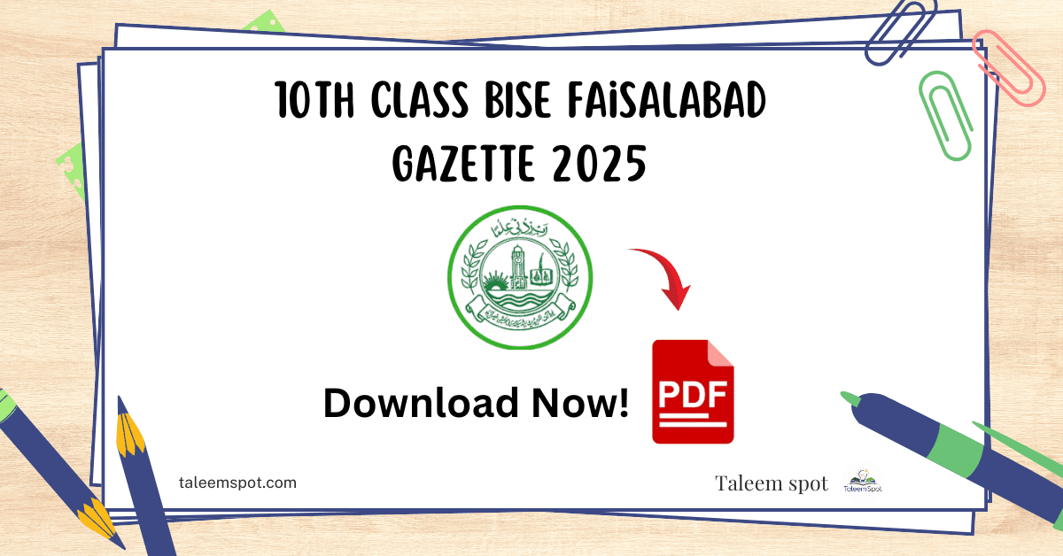 The BISE Faisalabad 10th Class Gazette 2025 contains all of the SSC Part 2 results in a single, robust, searchable PDF for matric students from Faisalabad, Jhang, Chiniot, and Toba Tek Singh. This Gazette, which will be released in mid-July 2025, just hours after the official 10th Class results, will feature every student’s marks, pass/fail status, roll numbers, school rankings, and top position holders from all four districts.